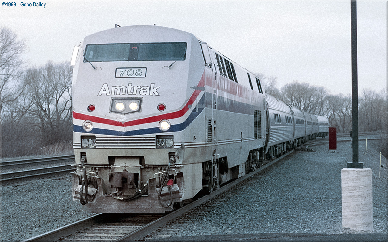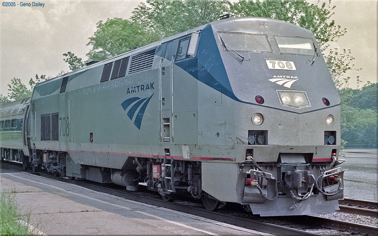 Built by General Electric Transportation Systems in August 1995 and numbered 708. This series of locomotives (a total of 18 would be built) were built to replace the EMD FL9's. These "Dual-Mode" units were built to operate on diesel power above-ground and on third-rail electric power when in the tunnels going into New York's Penn Station. Historical information about this locomotive provided by www.amtrakbythenumbers.com. |
