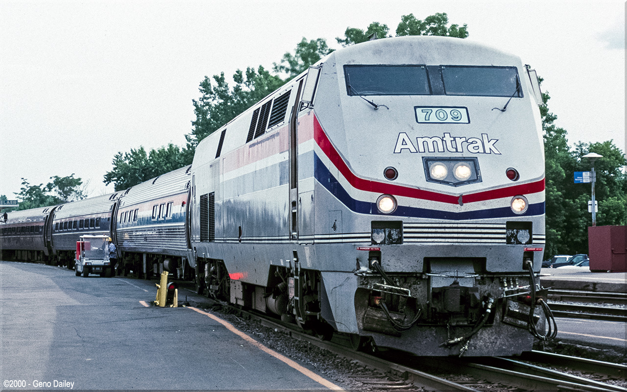 Built by General Electric Transportation Systems in August 1995 and numbered 709. This series of locomotives (a total of 18 would be built) were built to replace the EMD FL9's. These "Dual-Mode" units were built to operate on diesel power above-ground and on third-rail electric power when in the tunnels going into New York's Penn Station. Historical information about this locomotive provided by www.amtrakbythenumbers.com. |
