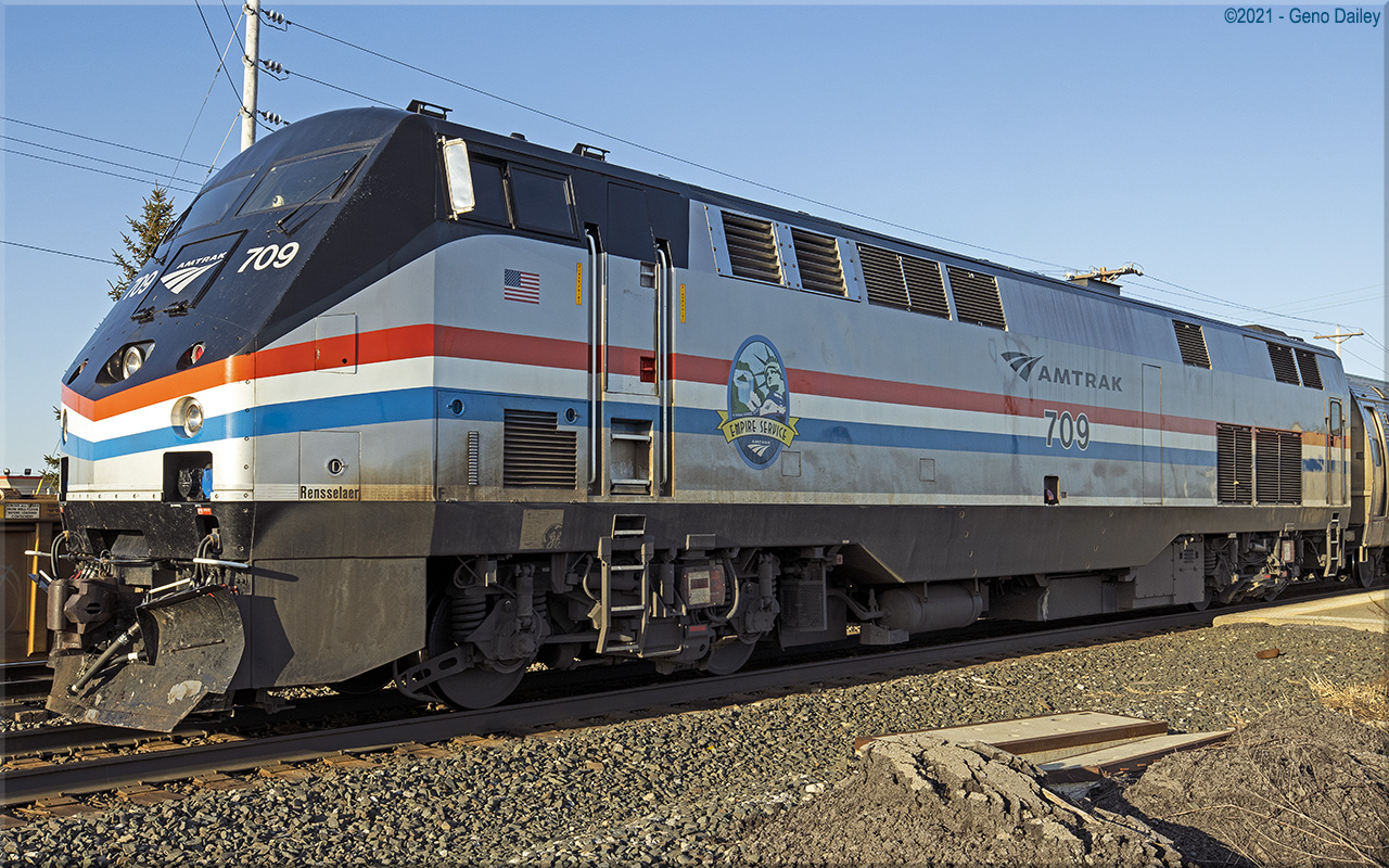 Built by General Electric Transportation Systems in August 1995 and numbered 709. This series of locomotives (a total of 18 would be built) were built to replace the EMD FL9's. These "Dual-Mode" units were built to operate on diesel power above-ground and on third-rail electric power when in the tunnels going into New York's Penn Station. With funding provided by the State of New York, these units have been or will be repainted into Phase III with a special "Empire Service" emblem on each side. This unit is also equipped with an escape hatch similar to Metro-North Railroad's P32's that operate into Grand Central Terminal since Amtrak ran service there in 2018 due to trackwork at Penn Station. Historical information about this locomotive provided by www.amtrakbythenumbers.com. |