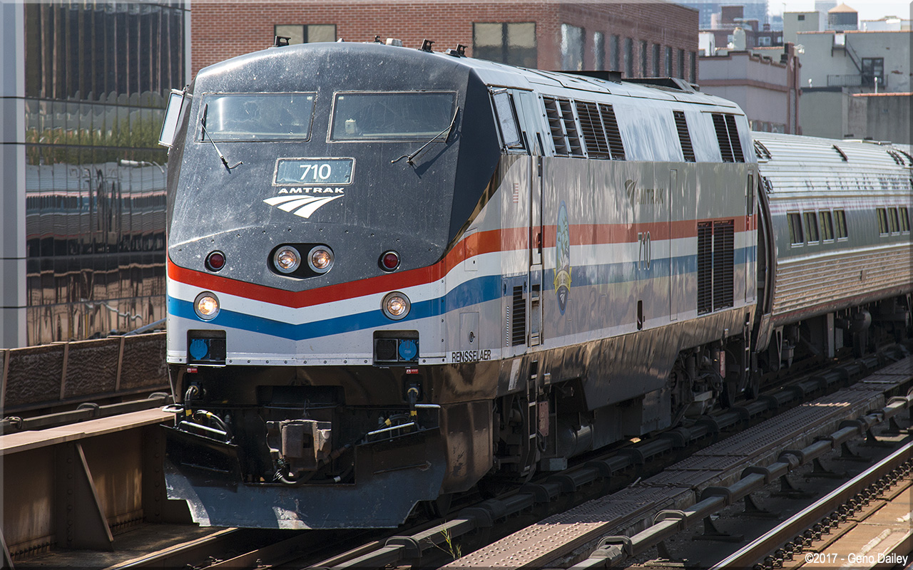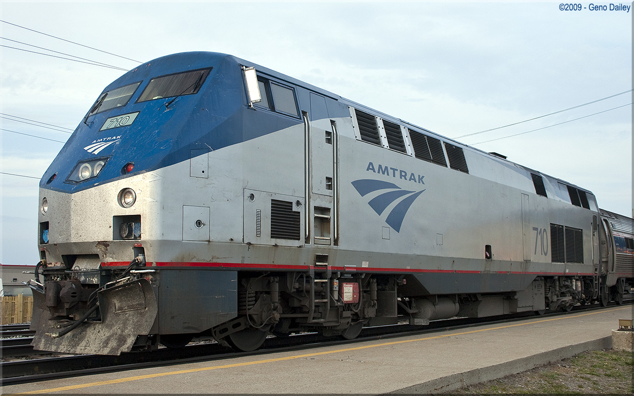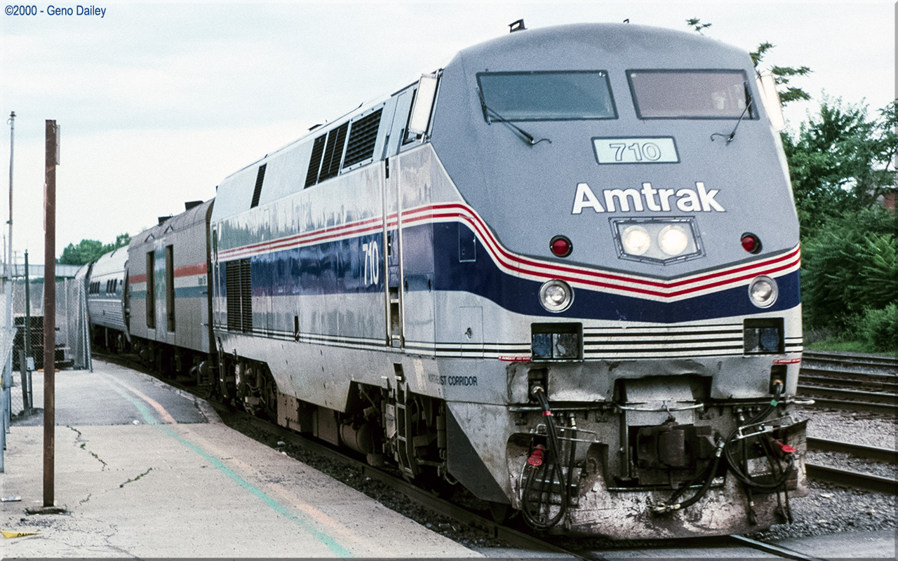 Built by General Electric Transportation Systems in January 1998 and numbered 710. This series of locomotives (a total of 18 would be built) were built to replace the EMD FL9's. These "Dual-Mode" units were built to operate on diesel power above-ground and on third-rail electric power when in the tunnels going into New York's Penn Station. Historical information about this locomotive provided by www.amtrakbythenumbers.com. |