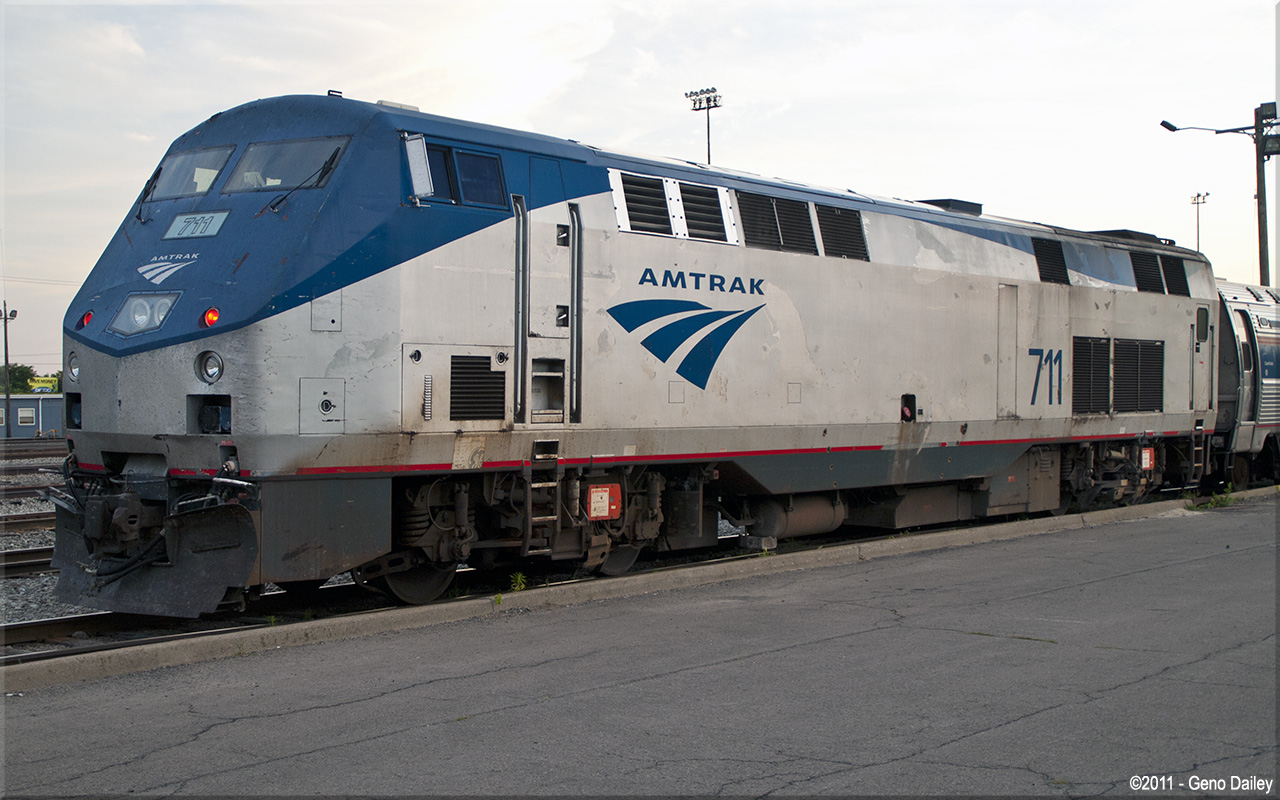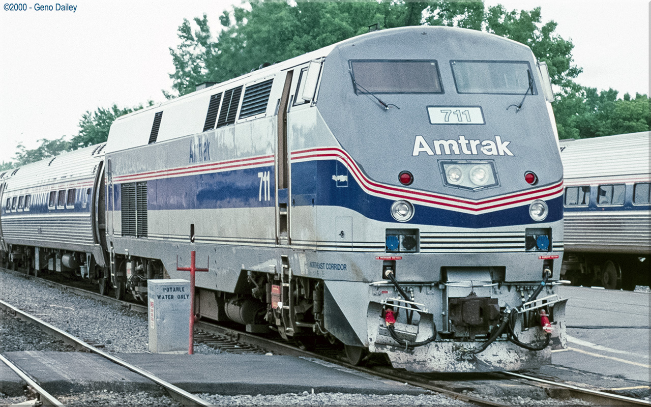 Built by General Electric Transportation Systems in January 1998 and numbered 711. This series of locomotives (a total of 18 would be built) were built to replace the EMD FL9's. These "Dual-Mode" units were built to operate on diesel power above-ground and on third-rail electric power when in the tunnels going into New York's Penn Station. Historical information about this locomotive provided by www.amtrakbythenumbers.com. |