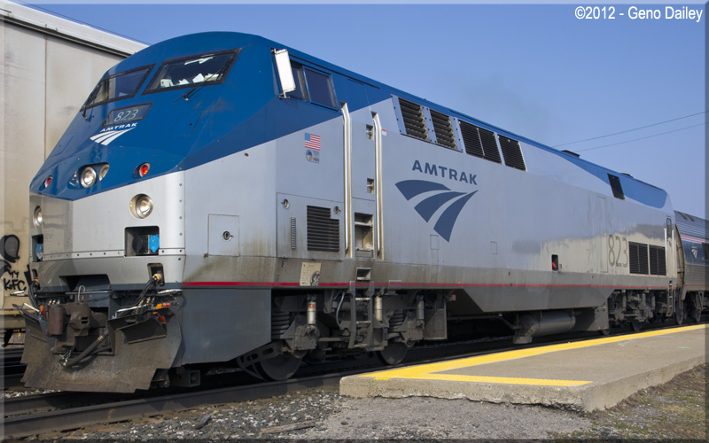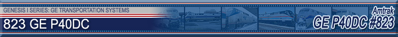 Now in Amtrak's current paint scheme, P40# 823 sports the Economic Stimulus shield above an American Flag next to its cab door. Historical information about this locomotive provided by www.amtrakbythenumbers.com. |
