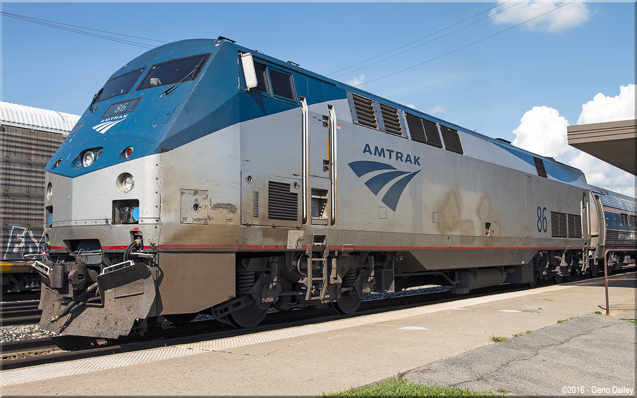 Built by General Electric Transportation Systems in May 1997 and numbered 86. This series of locomotives, also known as the Genesis Series II locomotives, were an upgraded version of the P40DC. Historical information about this locomotive provided by www.amtrakbythenumbers.com. |
