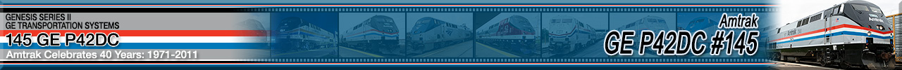 Built by General Electric Transportation Systems in February 2001 and numbered 145. This series of locomotives, also known as the Genesis Series II locomotives, were an upgraded version of the P40DC. This photo shows #145 in Phase III paint in celebration of Amtrak's 40th Anniversary in 2011. Historical information about this locomotive provided by www.amtrakbythenumbers.com. |