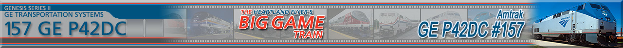 Built by General Electric Transportation Systems in April 2001 and numbered 157. This series of locomotives, also known as the Genesis Series II locomotives, were an upgraded version of the P40DC. This photo shows an updated version of the Phase V paint scheme on this unit along with decals for "The Heartland Flyer's Big Game Train". Historical information about this locomotive provided by www.amtrakbythenumbers.com. |