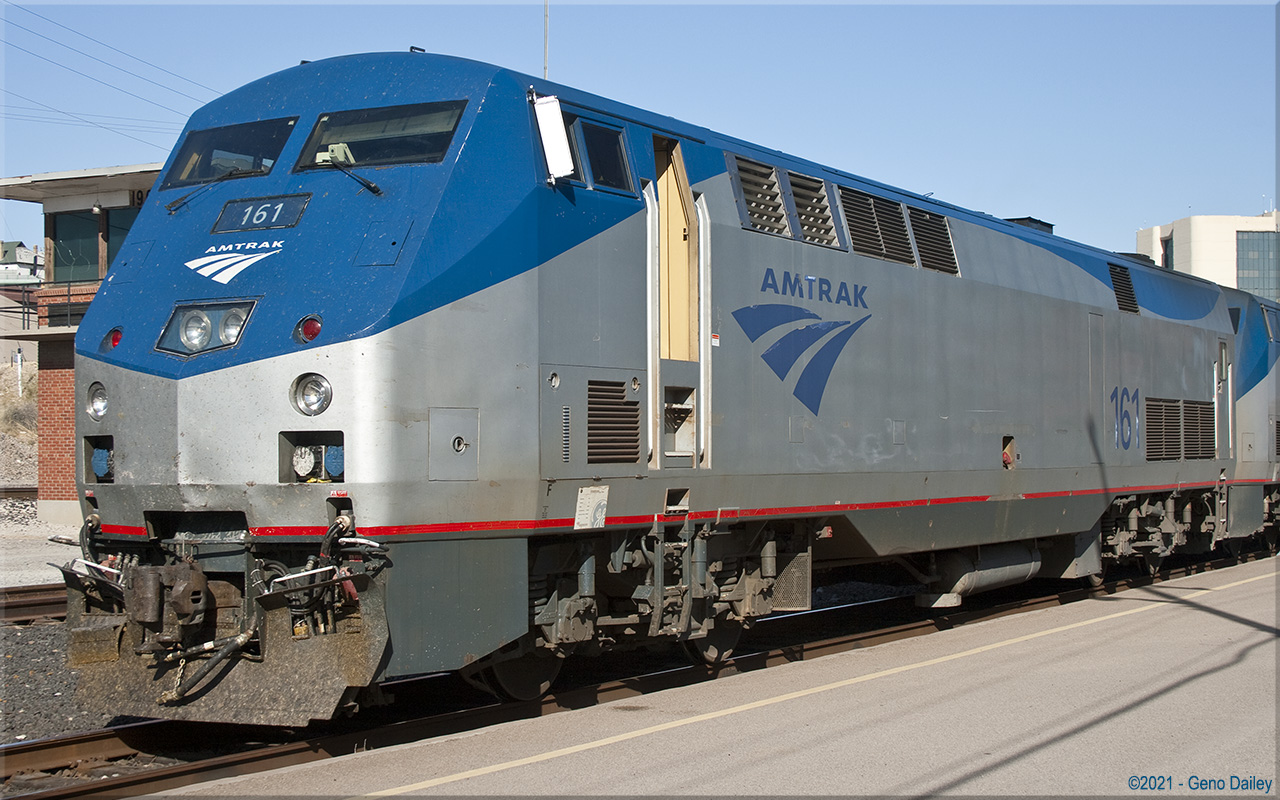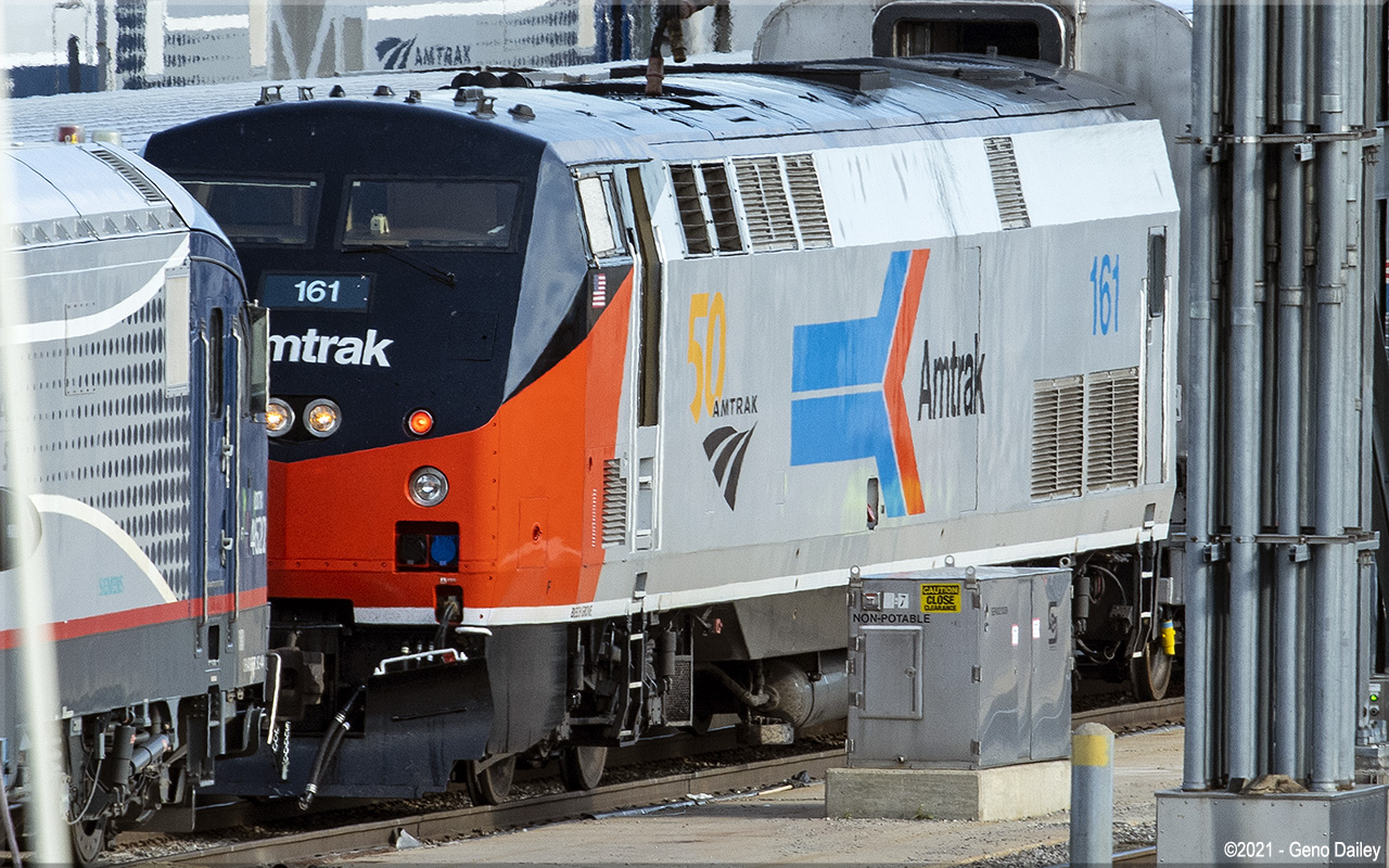 Built by General Electric Transportation Systems in May 2001and numbered 161. This series of locomotives, also known as the Genesis Series II locomotives, were an upgraded version of the P40DC. This photo shows #161 in Phase I paint in celebration of Amtrak's 50th Anniversary in 2021. Historical information about this locomotive provided by www.amtrakbythenumbers.com. |