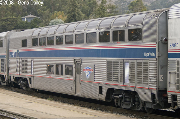 This car was originally built for the Santa Fe Railway as a high-level buffet-lounge car. Amtrak aquired the car in 1971. Today, this series of cars (Amtrak owns 5) have been completely refurbished and are currently used exclusively on Amtrak's Coast Starlight train between Los Angeles and Seattle as a lounge for sleeping car passengers. The car features lounge seating, couches, a theater, and dining tables inside. |