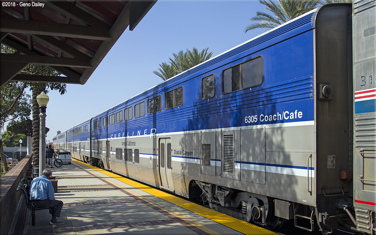 Built in December 2000 as a coach/cafe car featuring coach seating on the upper level and a snack bar on the lower level, operating on Pacific Surfliner trains between Los Angeles & San Diego along with Surfliner trains operating from Los Angeles north to as far as San Luis Obispo. These cars when first built didn't have names but would begin to have names starting in 2008 as they were cycled through Beech Grove for maintenance with this car later being named "Diablo Canyon". Historical information about this car provided by www.amtrakbythenumbers.com. |