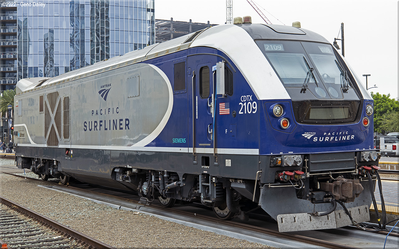 Built by Siemens Mobility in May 2018 and numbered CDTX 2109. These locomotives are owned by the State of California and are used on Amtrak California's Pacific Surfliner Route. Historical information about this locomotive provided by www.amtrakbythenumbers.com. |