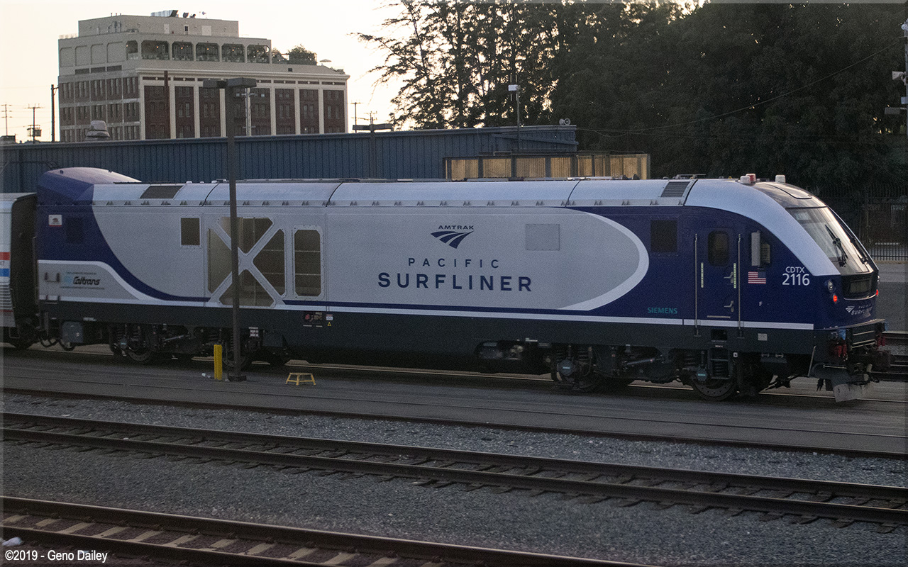 Built by Siemens Mobility in September 2018 and numbered CDTX 2116. These locomotives are owned by the State of California and are used on Amtrak California's Pacific Surfliner Route. Historical information about this locomotive provided by www.amtrakbythenumbers.com. |