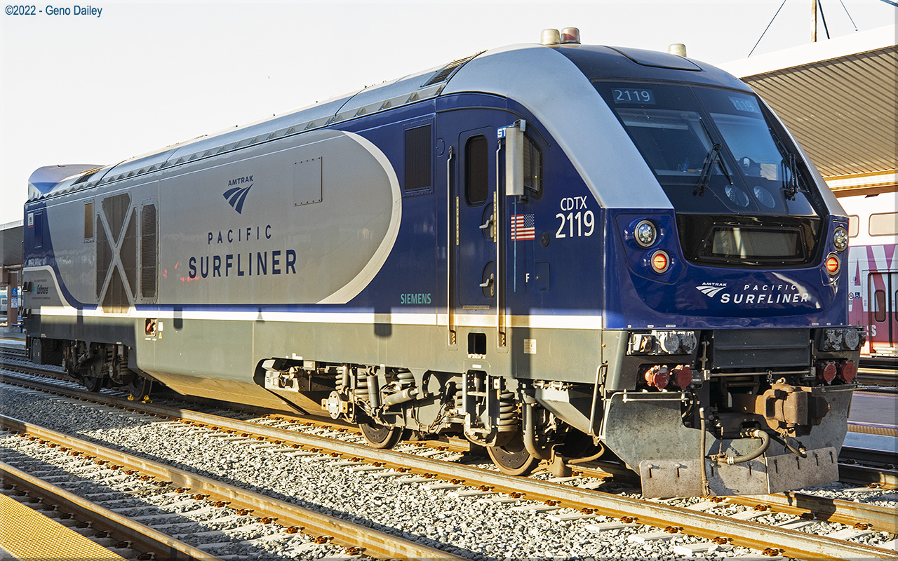 Built by Siemens Mobility in October 2018 and numbered CDTX 2119. These locomotives are owned by the State of California and are used on Amtrak California's Pacific Surfliner Route. Historical information about this locomotive provided by www.amtrakbythenumbers.com. |