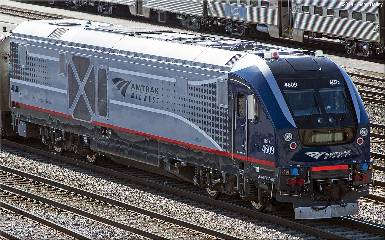 Built by Siemens Mobility in June 2017 and numbered IDTX 4609. These locomotives are owned by a consortium of midwestern states and are used on state-sponsored corridor routes operating out of Chicago. They are carrying Illinois Department of Transporation reporting marks (IDTX) since the state of Illinois lead the consortium of states including Illinois, Michigan, Missouri, and Wisconsin that ordered these locomotives. Historical information about this locomotive provided by www.amtrakbythenumbers.com. |