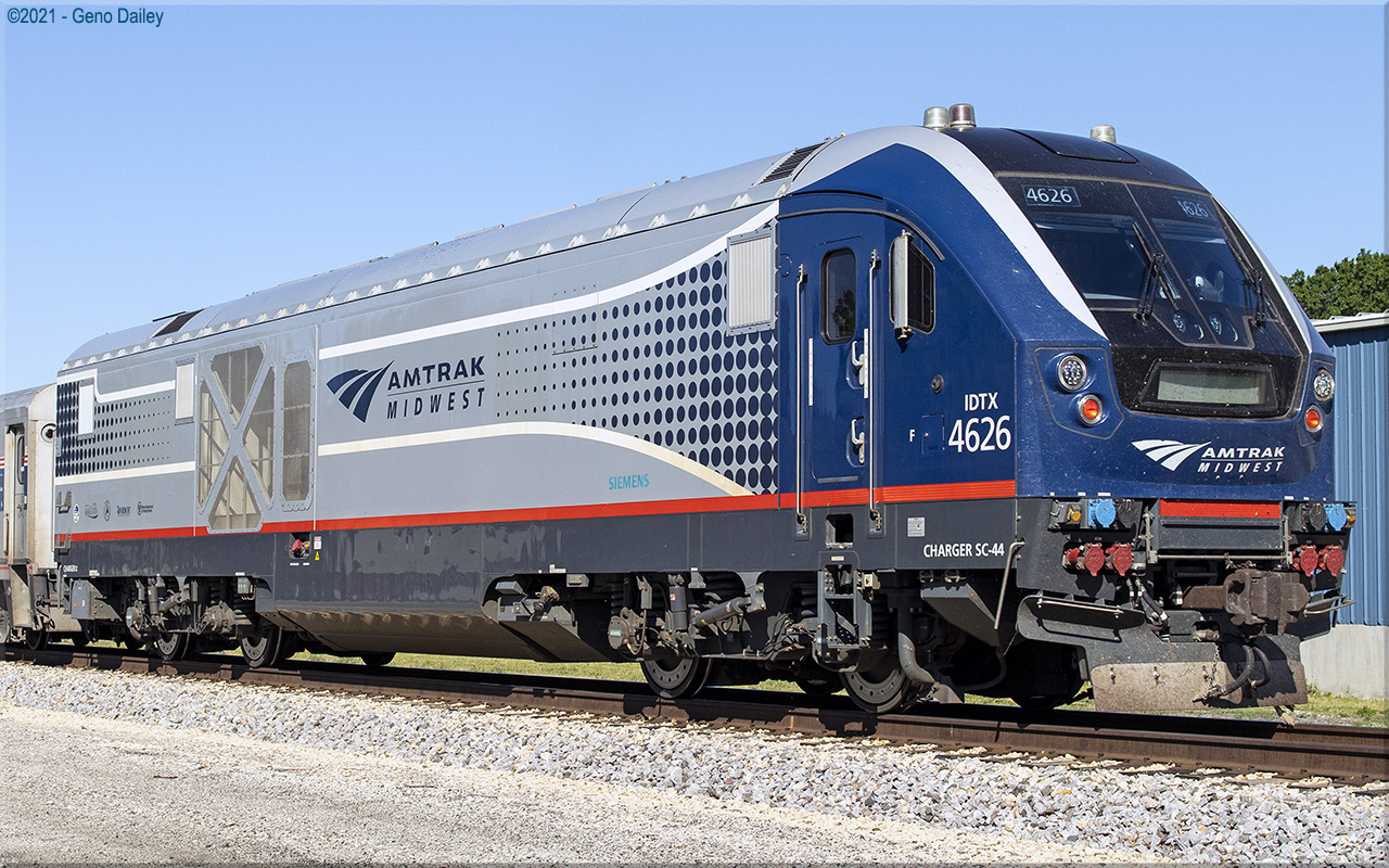Built by Siemens Mobility in September 2017 and numbered IDTX 4626. These locomotives are owned by a consortium of midwestern states and are used on state-sponsored corridor routes operating out of Chicago. They are carrying Illinois Department of Transporation reporting marks (IDTX) since the state of Illinois lead the consortium of states including Illinois, Michigan, Missouri, and Wisconsin that ordered these locomotives. Historical information about this locomotive provided by www.amtrakbythenumbers.com. |