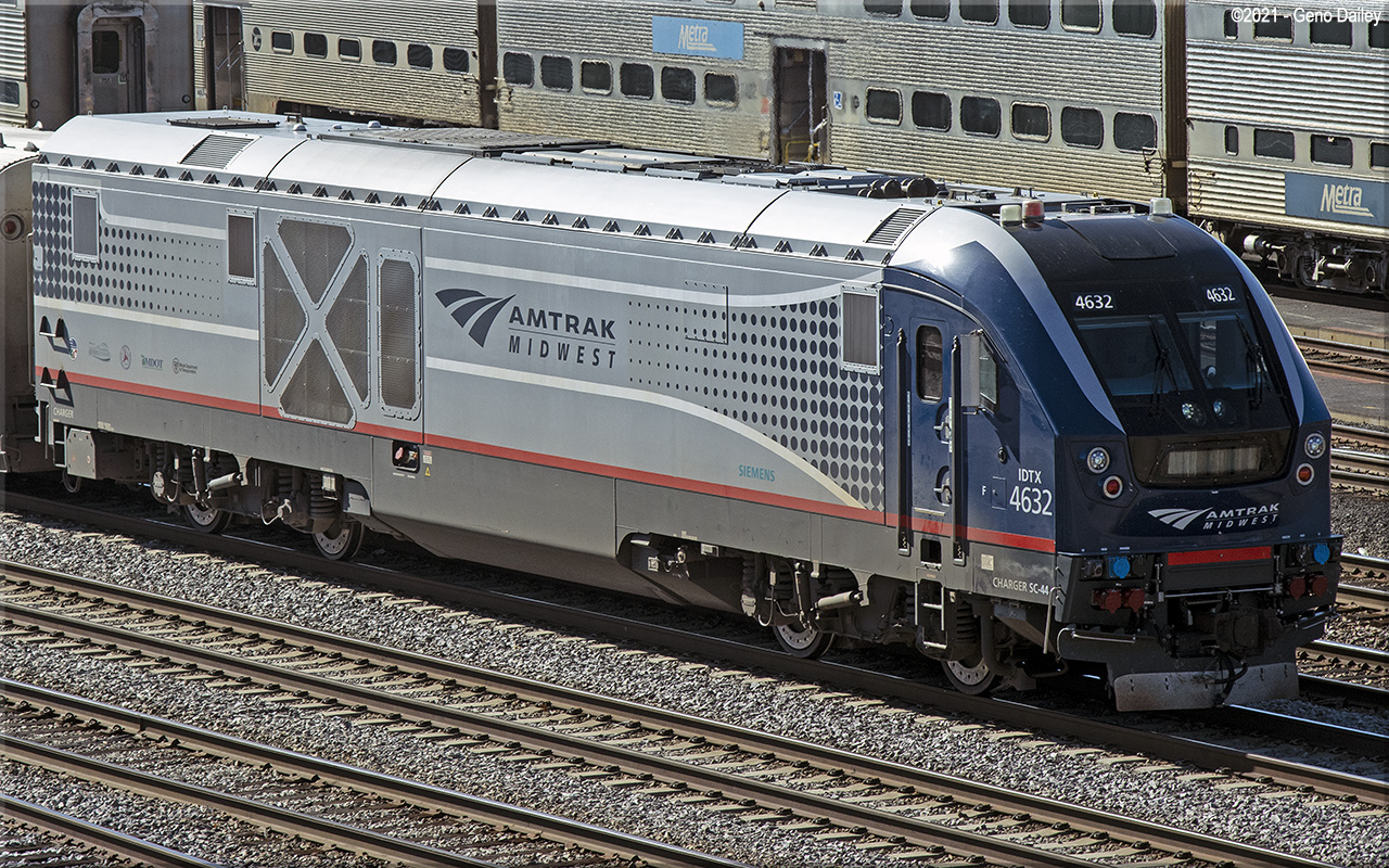 Built by Siemens Mobility in December 2017 and numbered IDTX 4632. These locomotives are owned by a consortium of midwestern states and are used on state-sponsored corridor routes operating out of Chicago. They are carrying Illinois Department of Transporation reporting marks (IDTX) since the state of Illinois lead the consortium of states including Illinois, Michigan, Missouri, and Wisconsin that ordered these locomotives. Historical information about this locomotive provided by www.amtrakbythenumbers.com. |