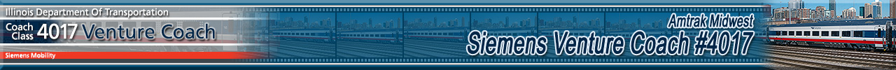 Built by Siemens Mobility in November 2020 and numbered 4017. These coaches were built for use on state-sponsored corridor routes operating out of Chicago to other destinations in Illinois, as well as trains to Michigan, Missouri & Wisconsin. Historical information about this locomotive provided by www.amtrakbythenumbers.com. |