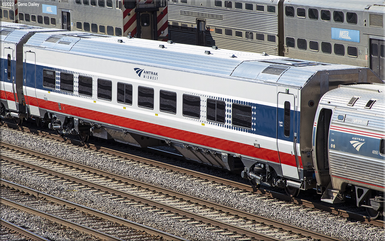 Built by Siemens Mobility in June 2021 and numbered 4117. This coach is part of what is known as a "Married Pair" of two separate coaches that are semi-permanently connected together. These coaches were built for use on state-sponsored corridor routes operating out of Chicago to other destinations in Illinois, as well as trains to Michigan, Missouri & Wisconsin. Historical information about this locomotive provided by www.amtrakbythenumbers.com. |