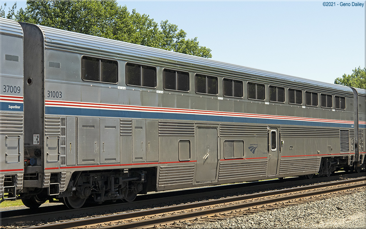Built in 1980 as a 62 seat coach with a baggage room occupying part of the lower level of the car. Converted into a smoker coach with an enclosed, ventilated smoking room built inside the baggage room in February 1997 and renumbered 31503. Converted back into a standard coach baggage car in February 2005 and renumbered back to 31003 after Amtrak eliminated smoking onboard most trains. Historical information about this car provided by www.amtrakbythenumbers.com. |