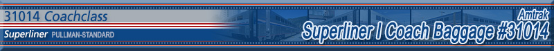 Built originally as a Coach/Baggage car, it's baggage area on the lower level was converted to an enclosed Smoking Lounge and renumbered 31514 in September 1997. Converted back to its original Coach/Baggage configuration in May 2004 after Amtrak eliminated smoking onboard on most routes and renumbered back to 31014. Historical Information about this car provided by