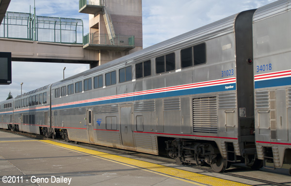 This car was first built as Coach/Baggage #31023, later reconfigured into Smoking Coach #31523, then configured back into Coach/Baggage #31023 after Amtrak discontinued smoking onboard most routes.