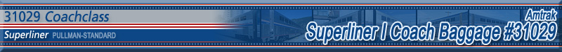 This car was originally built as a Coach with the upper level featuring coach seating and the lower level featuring a large baggage room in the space that would otherwise be fitted with additional seating. In 1997, the lower level of this car was converted into an enclosed smoking lounge and the car was renumbered 31529. Amtrak eventually prohibited smoking onboard all routes except the Auto Train, and this car was converted back into a Coach Baggage car in September 2005 and renumbered back to its original number 31029. Historical Information about this car provided by www.amtrakbythenumbers.com. |