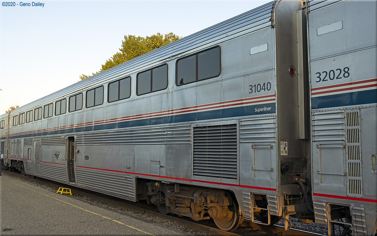 Built in 1980 as a 62 seat coach with a baggage room occupying part of the lower level of the car. Converted into a smoker coach with an enclosed, ventilated smoking room built inside the baggage room in March 1997 and renumbered 31540. Converted back into a standard coach baggage car in October 2004 and renumbered back to 31040 after Amtrak eliminated smoking onboard most trains. Historical information about this car provided by www.amtrakbythenumbers.com. |