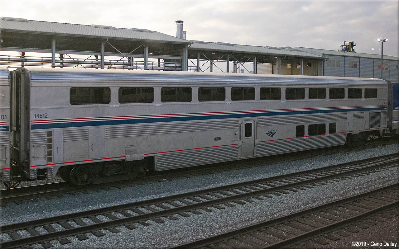Built in 1995 as a 74 seat coach and numbered 34112. Converted to a family coach in 1996 and renumbered 34512. Sometime in 2008-2009, the lower level of the car was equipped with video arcade games. Amtrak has since returned these cars to regular coaches, having replaced the arcade on the lower level with the normal 12 coach seats found in normal Superliner coaches, still retaining the number 34515. This car is now used for Business Class service on the Coast Starlight. Historical information about this car provided by www.amtrakbythenumbers.com. |