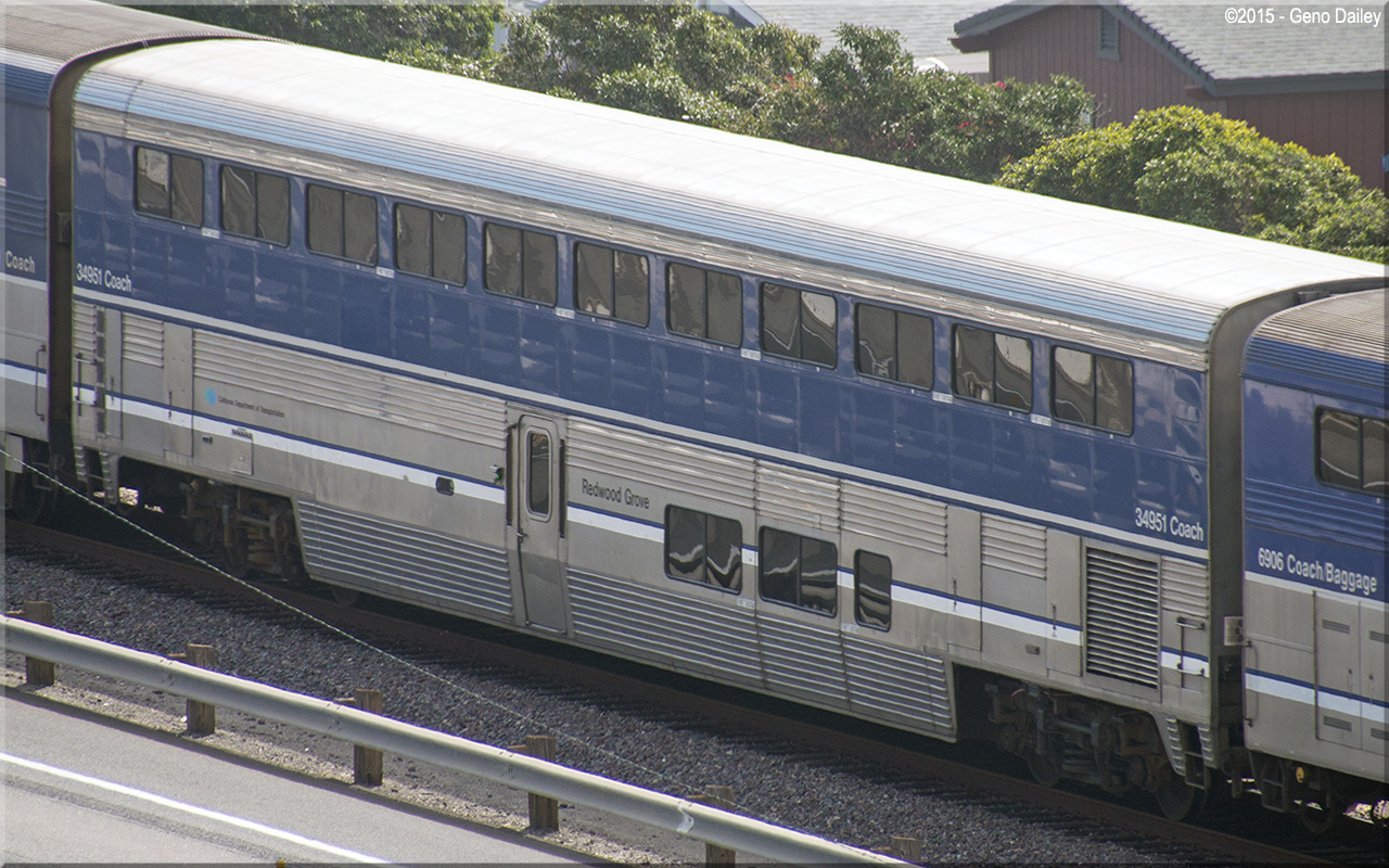 Built in 1979 as a 74 seat coach and numbered 34051. After a derailment in Georgetown, Ontario Canada in November 1999, the car was stored until being repaired using funding provided by the California Department Of Transportation. In May 2009, the car was renumbered 34951 after being repaired and named "Redwood Grove", it now operates on Pacific Surfliner trains and features 80 seats in the upper level of the car. Historical information about this car provided by www.amtrakbythenumbers.com and Web Lurker's DOME.main. |