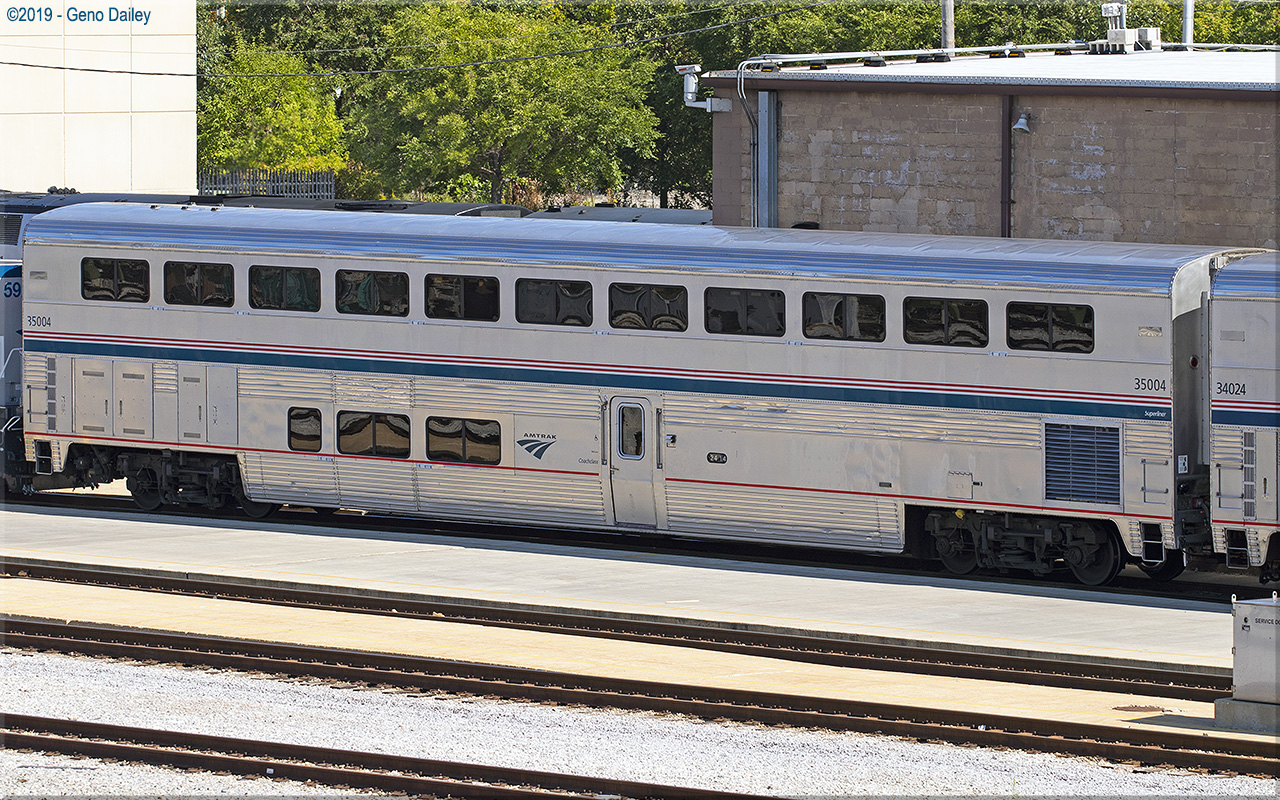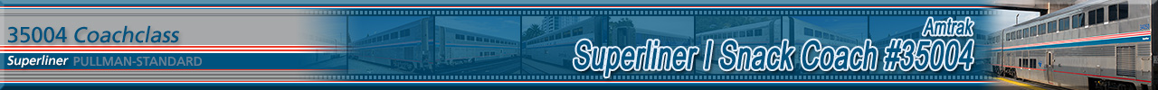 Built in 1979 as a 74 seat coach and numbered 34011. The 12 seats in the lower level of the car were removed and the space converted to a snack bar by November 1980 and the car renumbered 35004. Historical information about this car provided by www.amtrakbythenumbers.com. |