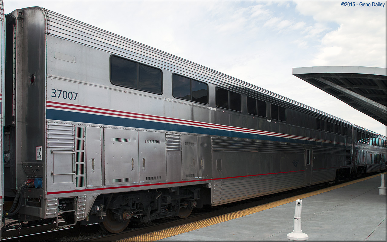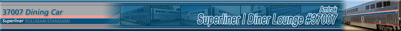 Built in 1980 as a dining car and numbered 38018. Converted to a diner-lounge configuration to allow the car to be used as a dining car and lounge car in the same car. Diner-Lounge conversion was completed in December 2007 and the car renumbered 37007. Historical information about this car provided by www.amtrakbythenumbers.com. |