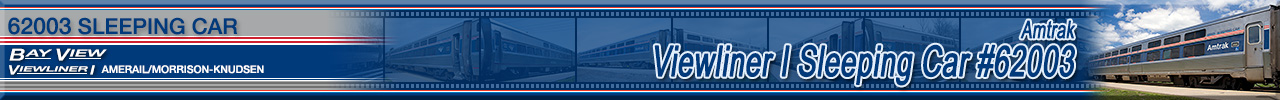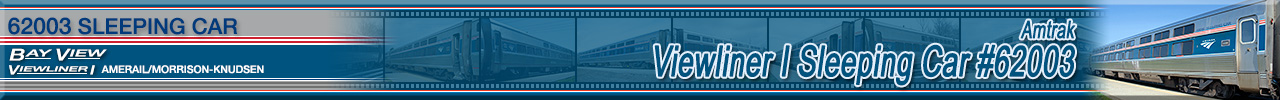 Built by Morrison-Knudsen in October 1995 as a single-level sleeping car originally named "Bay View" and numbered 62003. As seen in the above photo, Amtrak's newer logo and the updated blue color were added to the existing red and white stripes with the car still retaining its name. Historical information about this car provided by www.amtrakbythenumbers.com. |