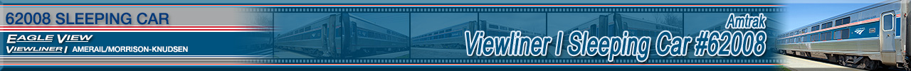 Built by Amerail in March 1996 as a single-level sleeping car originally named "Eagle View" and numbered 62008. As seen in the above photo, Amtrak's newer logo and the updated blue color were added to the existing red and white stripes with the car still retaining its name. Historical information about this car provided by www.amtrakbythenumbers.com. |