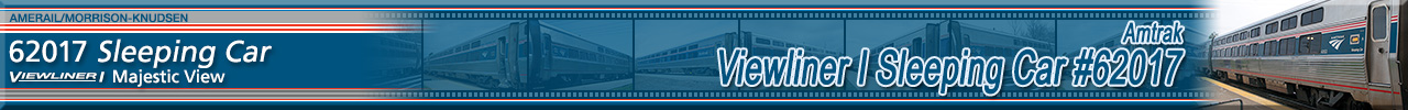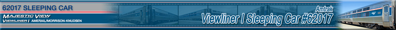 Built by Amerail in March 1996 as a single-level sleeping car originally named "Majestic View" and numbered 62017. As seen in the above photo, in Phase VI paint, there is no name on the car any longer, being replaced simply with the word "Viewliner" and its car number. Historical information about this car provided by www.amtrakbythenumbers.com. |