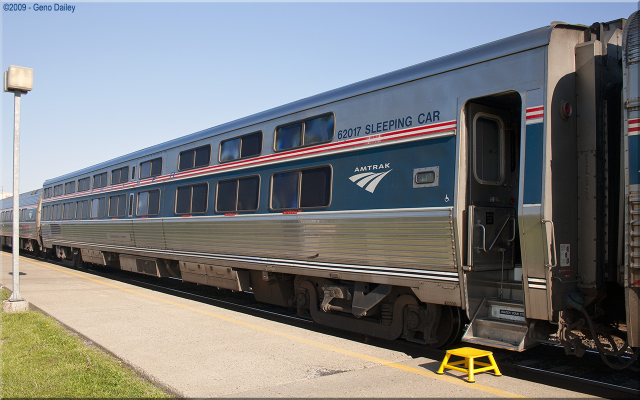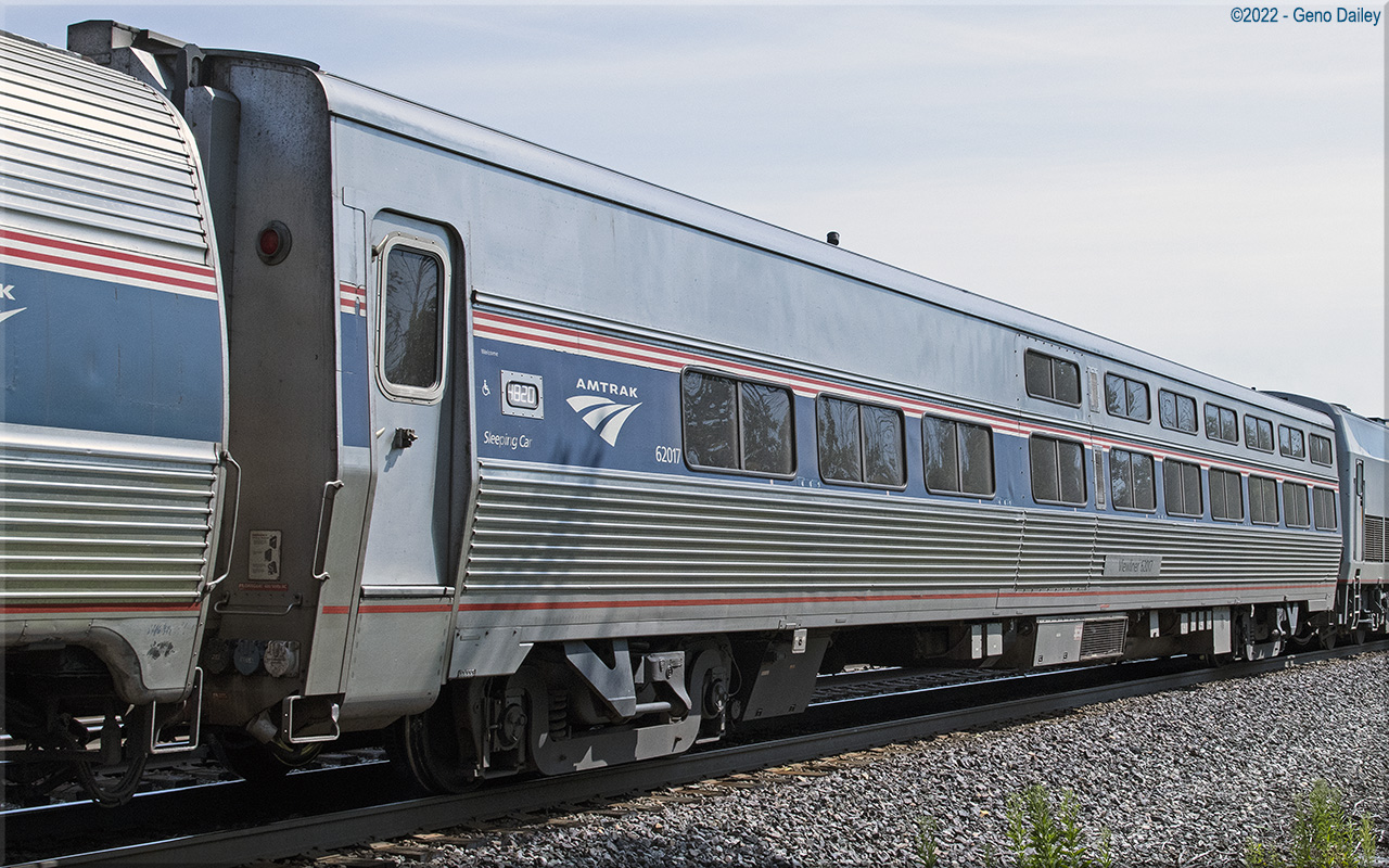 Built by Amerail in March 1996 as a single-level sleeping car originally named "Majestic View" and numbered 62017. As seen in the above photo, Amtrak's newer logo and the updated blue color were added to the existing red and white stripes (that were on the car as delivered) with the car still retaining its name. Historical information about this car provided by www.amtrakbythenumbers.com. |