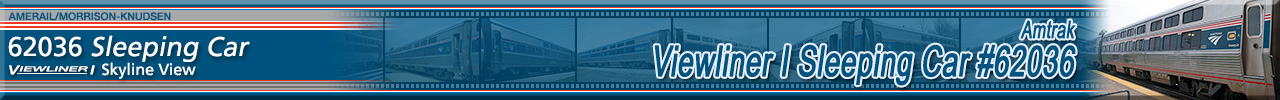 Built by Amerail in September 1996 as a single-level sleeping car originally named "Skyline View" and numbered 62036. As seen in the above photo, in Phase VI paint, there is no name on the car any longer, being replaced simply with the word "Viewliner" and its car number. Historical information about this car provided by www.amtrakbythenumbers.com. |