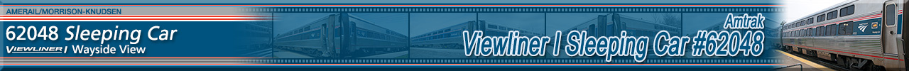 Built by Amerail in December 1996 as a single-level sleeping car originally named "Wayside View" and numbered 62048. As seen in the above photo, in Phase VI paint, there is no name on the car any longer, being replaced simply with the word "Viewliner" and its car number. Historical information about this car provided by www.amtrakbythenumbers.com. |