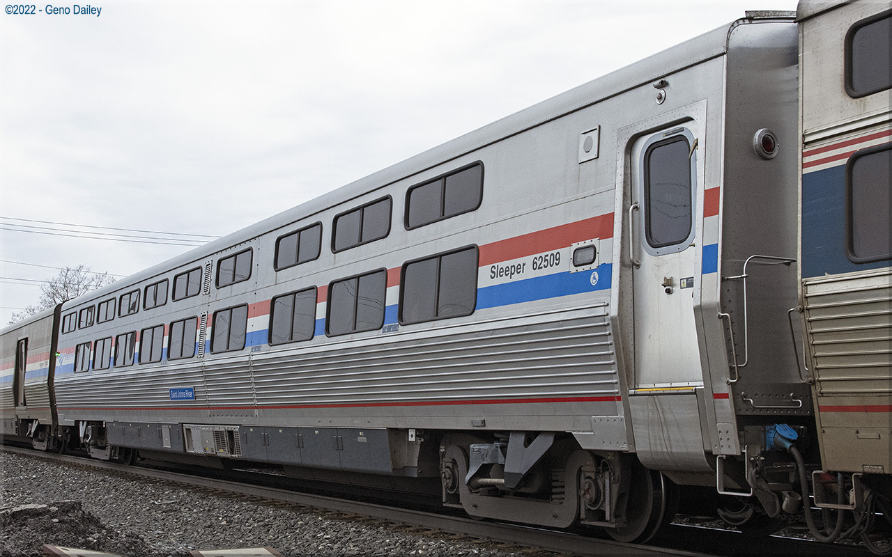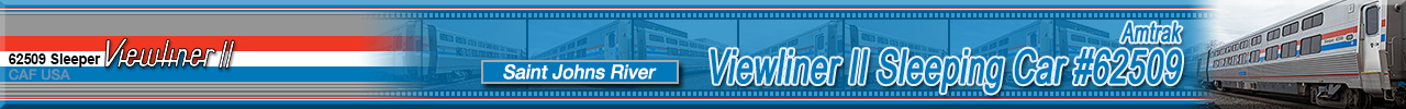 de Ferrocarrilesas) in Elmira Heights, NY in June 2020 as a single-level sleeping car named "Saint Johns River" and numbered 62509. These cars were part of the 130 car Viewliner II order and were all delivered in Amtrak's classic Phase III paint scheme while sporting the current Amtrak "Travelmark" Logo. This series of sleeping cars are named after various rivers and eventually all Viewliner I sleepers will be renamed after rivers as well to match these cars. Historical information about this car provided by www.amtrakbythenumbers.com. |
