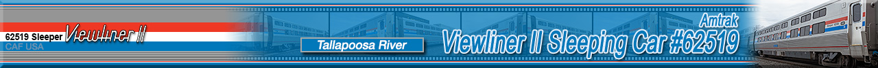 de Ferrocarrilesas) in Elmira Heights, NY in April 2021 as a single-level sleeping car named "Tallapoosa River" and numbered 62519. These cars were part of the 130 car Viewliner II order and were all delivered in Amtrak's classic Phase III paint scheme while sporting the current Amtrak "Travelmark" Logo. This series of sleeping cars are named after various rivers and eventually all Viewliner I sleepers will be renamed after rivers as well to match these cars. Historical information about this car provided by www.amtrakbythenumbers.com. |
