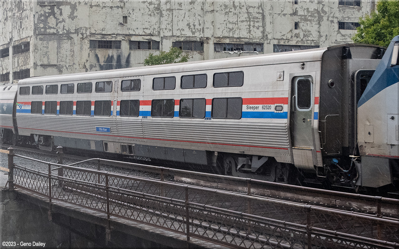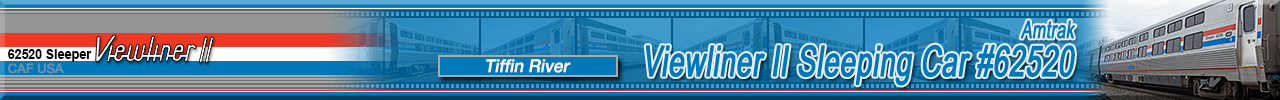 de Ferrocarrilesas) in Elmira Heights, NY in June 2021 as a single-level sleeping car named "Tiffin River" and numbered 62520. These cars were part of the 130 car Viewliner II order and were all delivered in Amtrak's classic Phase III paint scheme while sporting the current Amtrak "Travelmark" Logo. This series of sleeping cars are named after various rivers and eventually all Viewliner I sleepers will be renamed after rivers as well to match these cars. Historical information about this car provided by www.amtrakbythenumbers.com. |