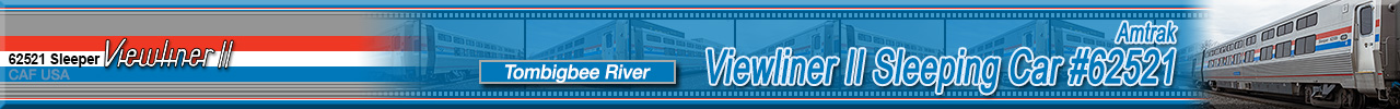 de Ferrocarrilesas) in Elmira Heights, NY in June 2021 as a single-level sleeping car named "Tombigbee River" and numbered 62521. These cars were part of the 130 car Viewliner II order and were all delivered in Amtrak's classic Phase III paint scheme while sporting the current Amtrak "Travelmark" Logo. This series of sleeping cars are named after various rivers and eventually all Viewliner I sleepers will be renamed after rivers as well to match these cars. Historical information about this car provided by www.amtrakbythenumbers.com. |