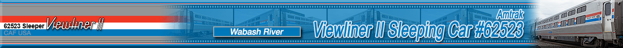de Ferrocarrilesas) in Elmira Heights, NY in August 2021 as a single-level sleeping car named "Wabash River" and numbered 62523. These cars were part of the 130 car Viewliner II order and were all delivered in Amtrak's classic Phase III paint scheme while sporting the current Amtrak "Travelmark" Logo. This series of sleeping cars are named after various rivers and eventually all Viewliner I sleepers will be renamed after rivers as well to match these cars. Historical information about this car provided by www.amtrakbythenumbers.com. |
