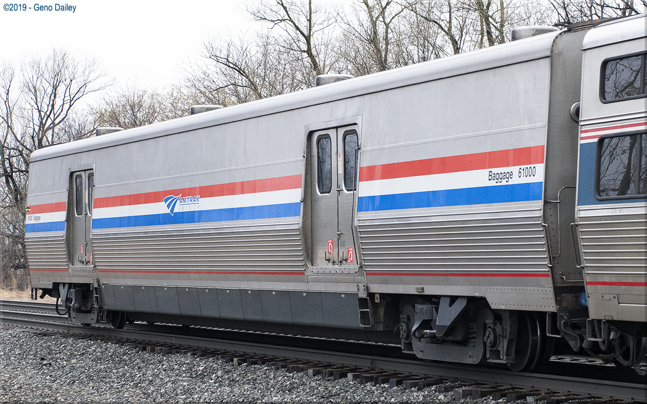 de Ferrocarrilesas) in Elmira Heights, NY in 2012 and numbered 61000. These cars were built to replace Heritage Baggage cars used systemwide and were all delivered in Amtrak's classic Phase III paint scheme while sporting the current Amtrak "Travelmark" Logo. Historical information about this car provided by www.amtrakbythenumbers.com. |