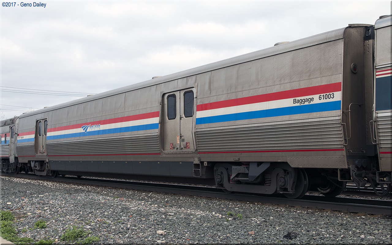 de Ferrocarrilesas) in Elmira Heights, NY in 2013 and numbered 61003. These cars were built to replace Heritage Baggage cars used systemwide and were all delivered in Amtrak's classic Phase III paint scheme while sporting the current Amtrak "Travelmark" Logo. Historical information about this car provided by www.amtrakbythenumbers.com. |