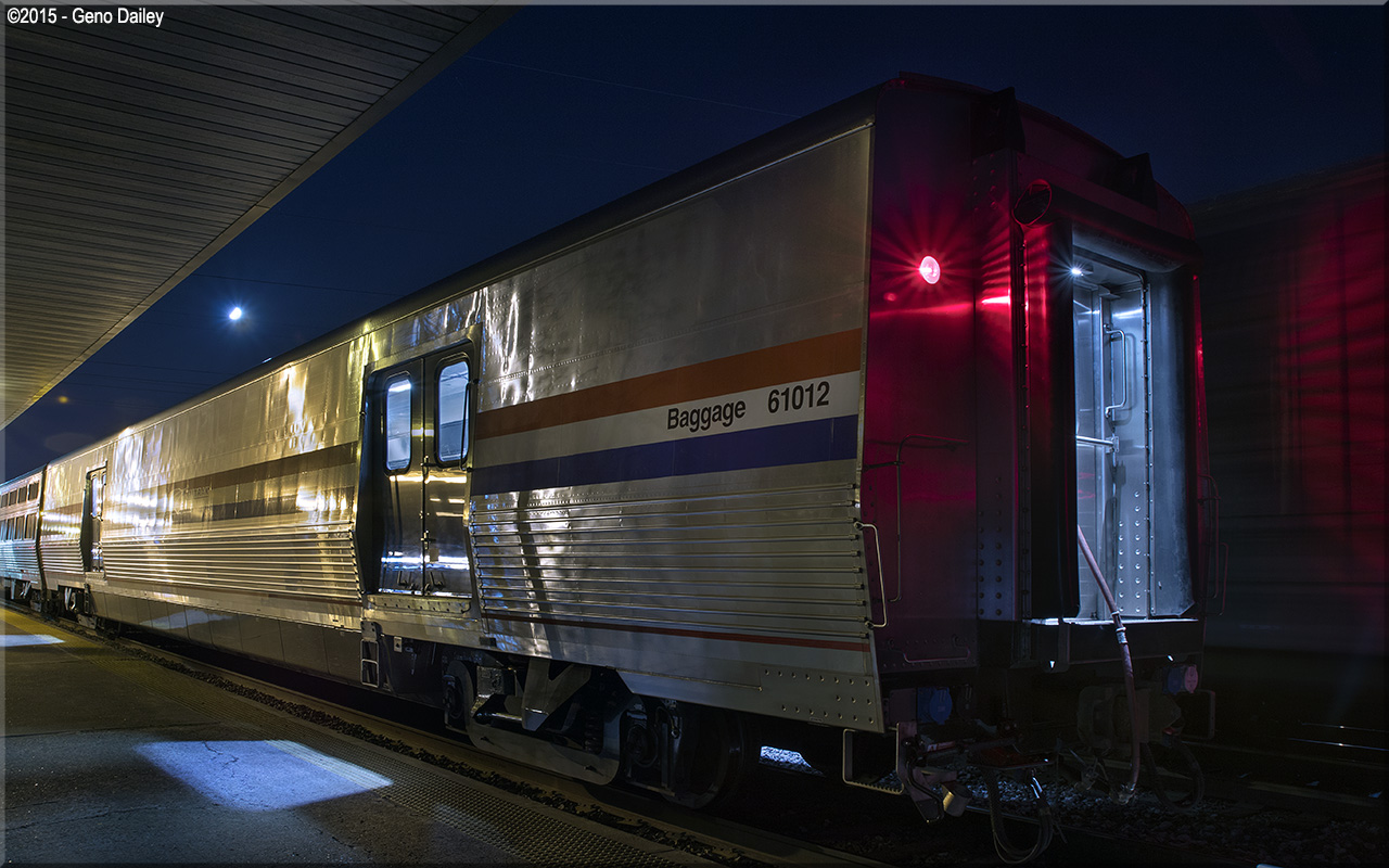 de Ferrocarrilesas) in Elmira Heights, NY in 2014 and numbered 61012. These cars were built to replace Heritage Baggage cars used systemwide and were all delivered in Amtrak's classic Phase III paint scheme while sporting the current Amtrak "Travelmark" Logo. Historical information about this car provided by www.amtrakbythenumbers.com. |