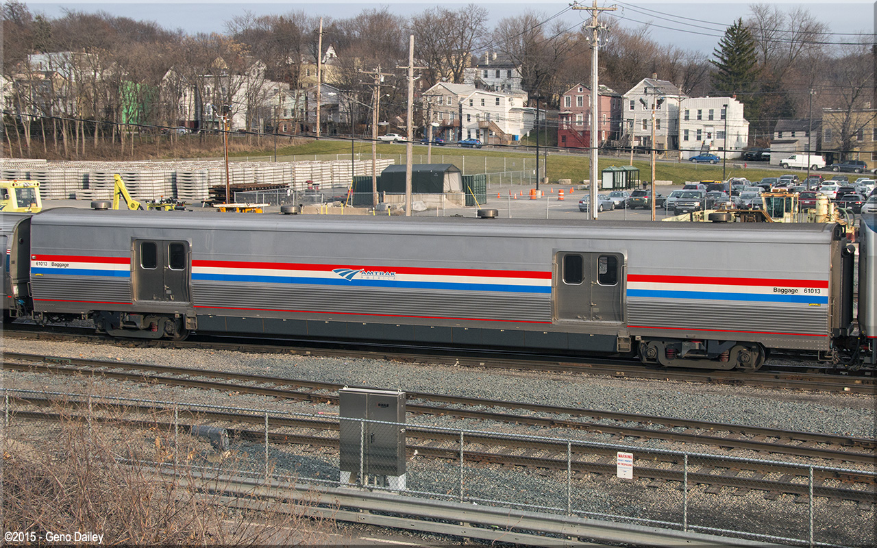 de Ferrocarrilesas) in Elmira Heights, NY in 2014 and numbered 61013. These cars were built to replace Heritage Baggage cars used systemwide and were all delivered in Amtrak's classic Phase III paint scheme while sporting the current Amtrak "Travelmark" Logo. Historical information about this car provided by www.amtrakbythenumbers.com. |