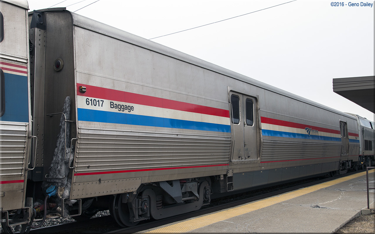 de Ferrocarrilesas) in Elmira Heights, NY in 2014 and numbered 61017. These cars were built to replace Heritage Baggage cars used systemwide and were all delivered in Amtrak's classic Phase III paint scheme while sporting the current Amtrak "Travelmark" Logo. Historical information about this car provided by www.amtrakbythenumbers.com. |