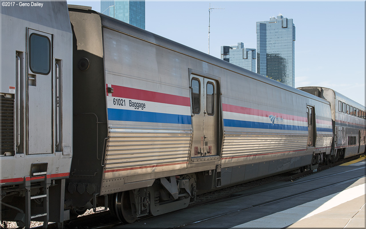 de Ferrocarrilesas) in Elmira Heights, NY in 2014 and numbered 61021. These cars were built to replace Heritage Baggage cars used systemwide and were all delivered in Amtrak's classic Phase III paint scheme while sporting the current Amtrak "Travelmark" Logo. Historical information about this car provided by www.amtrakbythenumbers.com. |
