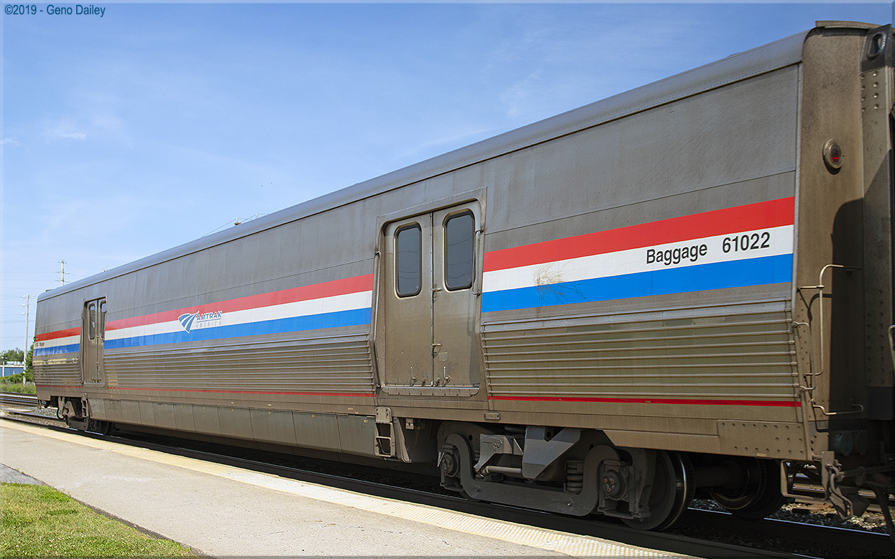 de Ferrocarrilesas) in Elmira Heights, NY in 2014 and numbered 61022. These cars were built to replace Heritage Baggage cars used systemwide and were all delivered in Amtrak's classic Phase III paint scheme while sporting the current Amtrak "Travelmark" Logo. Historical information about this car provided by www.amtrakbythenumbers.com. |