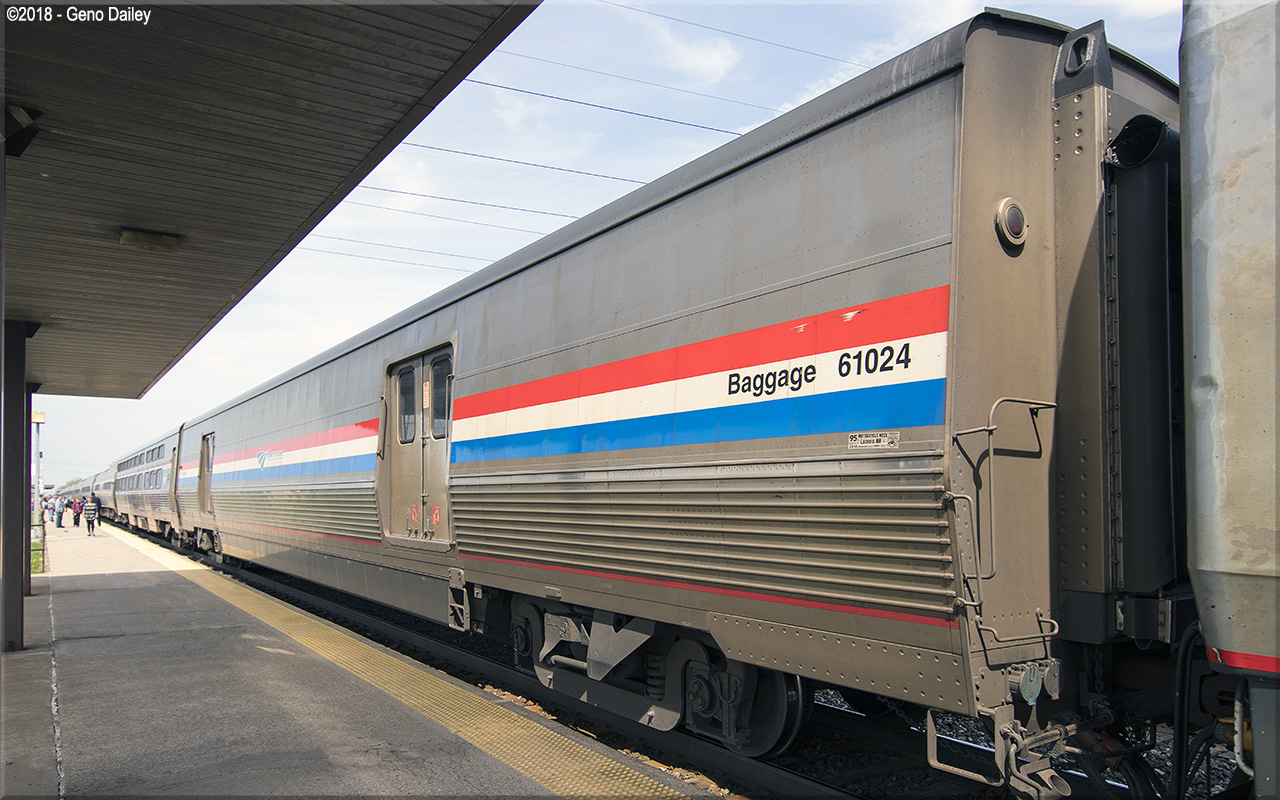 de Ferrocarrilesas) in Elmira Heights, NY in 2014 and numbered 61024. These cars were built to replace Heritage Baggage cars used systemwide and were all delivered in Amtrak's classic Phase III paint scheme while sporting the current Amtrak "Travelmark" Logo. Historical information about this car provided by www.amtrakbythenumbers.com. |