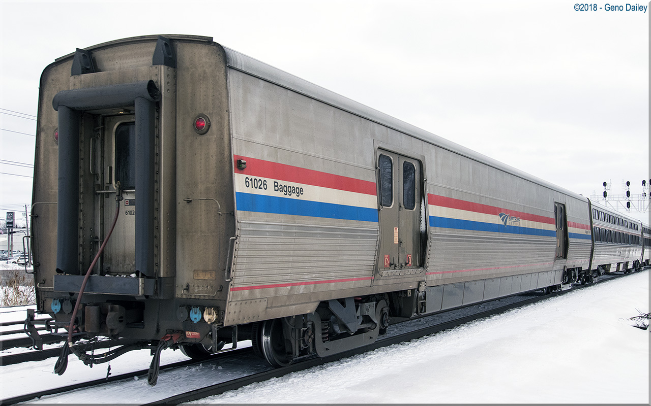 de Ferrocarrilesas) in Elmira Heights, NY in 2014 and numbered 61026. These cars were built to replace Heritage Baggage cars used systemwide and were all delivered in Amtrak's classic Phase III paint scheme while sporting the current Amtrak "Travelmark" Logo. Historical information about this car provided by www.amtrakbythenumbers.com. |