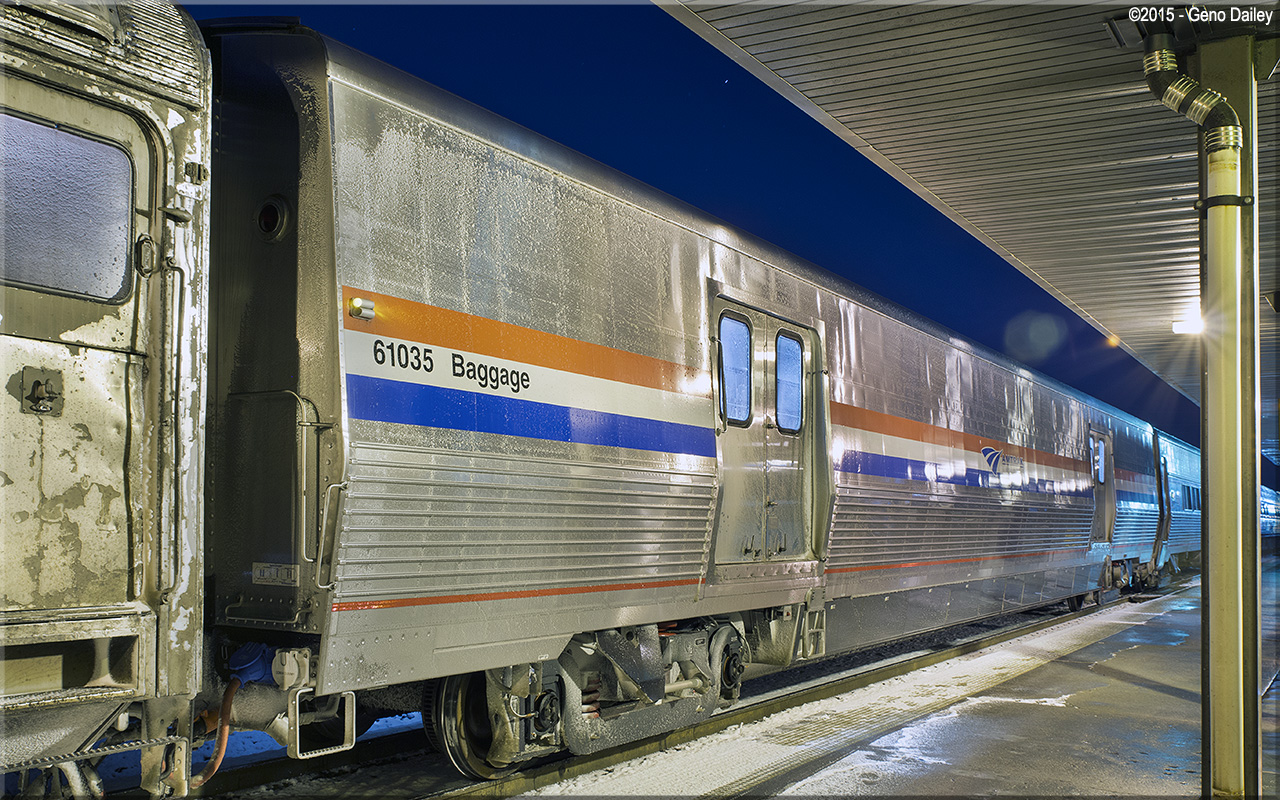 de Ferrocarrilesas) in Elmira Heights, NY in 2014 and numbered 61035. These cars were built to replace Heritage Baggage cars used systemwide and were all delivered in Amtrak's classic Phase III paint scheme while sporting the current Amtrak "Travelmark" Logo. Historical information about this car provided by www.amtrakbythenumbers.com. |